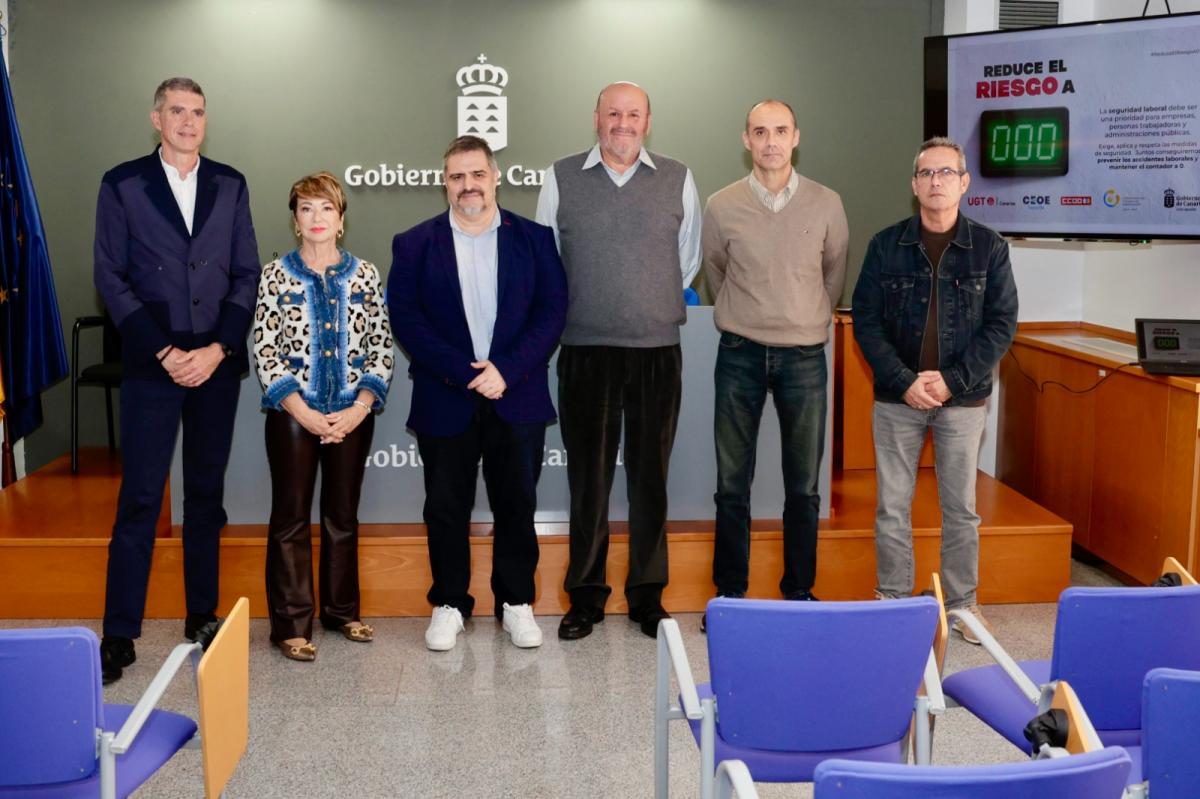 El director general de Trabajo del Gobierno de Canarias, José Ramón Rodríguez, y el director del Instituto Canario de Seguridad Laboral (Icasel), Elirerto Galván, junto a los agentes sociales, presentaron este martes la nueva campaña publicitaria de prevención de riesgos laborales.