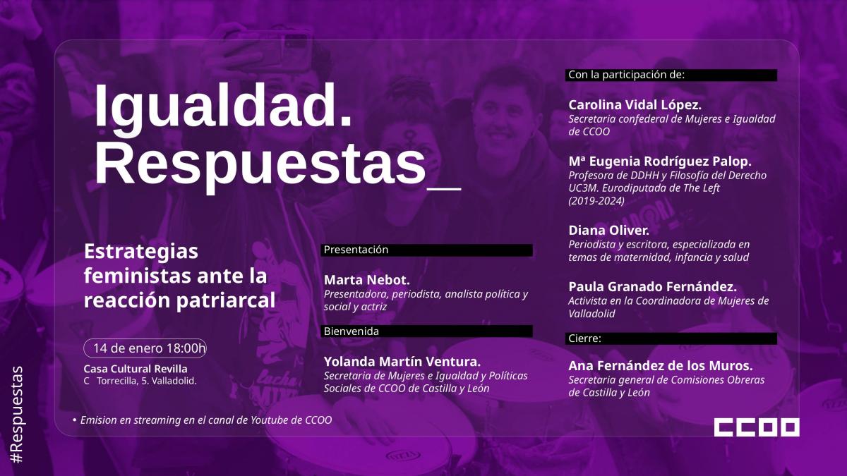 Comisiones Obreras organiza el próximo 14 de enero en Valladolid el encuentro ‘Igualdad. Respuestas. Estrategias feministas ante la reacción patriarcal’, en el marco de los paneles temáticos que el sindicato está organizando ante los desafíos que enfrenta la sociedad española.